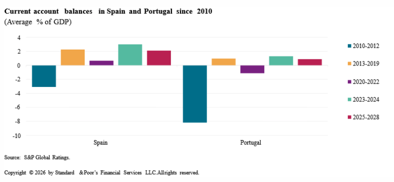 Η κρίση κρατικού χρέους και η κατάρρευση της αγοράς ακινήτων οδήγησαν σε απότομη διόρθωση των μεγάλων εξωτερικών ανισορροπιών σε Ισπανία και Πορτογαλία. Η υιοθέτηση του ευρώ είχε προηγουμένως συμπιέσει τις αποδόσεις των ομολόγων και διευκόλυνε τις εισαγωγές, ενισχύοντας τη διασυνοριακή χρηματοδότηση και διευρύνοντας τα ελλείμματα τρεχουσών συναλλαγών.