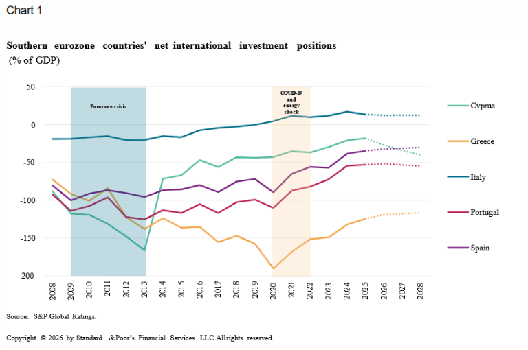 Οι σταθερές προοπτικές για Ελλάδα, Ιταλία, Πορτογαλία και Ισπανία αντανακλούν την εκτίμηση ότι η βελτίωση των εξωτερικών τους μεγεθών θα συνεχιστεί με πιο αργό ρυθμό, σε συνδυασμό με ήπια δημοσιονομική προσαρμογή και αυξημένους μακροοικονομικούς κινδύνους.