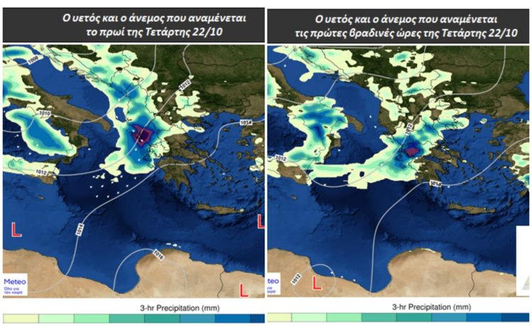 Στους σχετικούς χάρτες παρουσιάζεται ο υετός και ο άνεμος που αναμένονται (1) το πρωί και (2) τις πρώτες βραδινές ώρες της Τετάρτης 22/10.