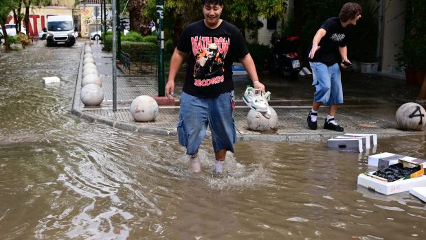 Στα πλάνα φαίνεται ακόμα ένας άνδρας να διασχίζει τον πλημμυρισμένο δρόμο με ένα μωρό στην αγκαλιά του.
