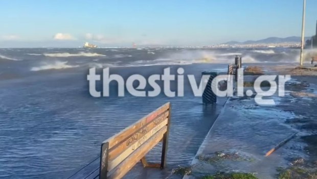 Λόγω των ανέμων, η θάλασσα στους Νέους Επιβάτες και στην Αγία Τριάδα βγήκε κυριολεκτικά στο οδόστρωμα, με το νερό να καλύπτει τον παραλιακό δρόμο.