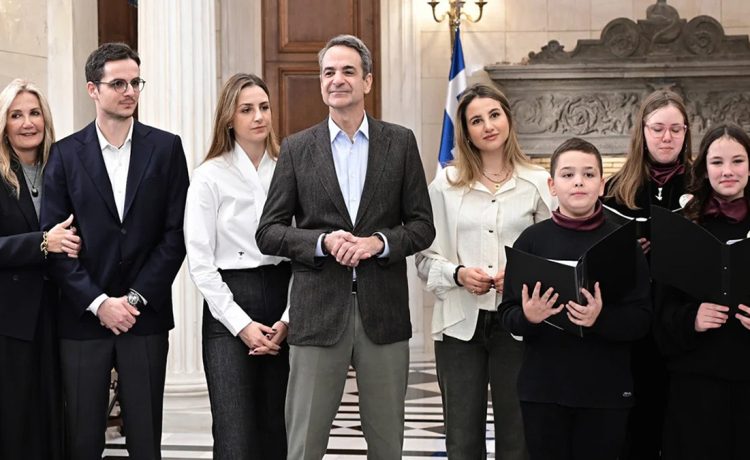 Ο Κυριάκος Μητσοτάκης άκουσε τα κάλαντα μαζί με τη σύζυγό του, Μαρέβα Γκραμπόφσκι – Μητσοτάκη και τα τρία τους παιδιά: Σοφία, Κωνσταντίνο και Δάφνη.