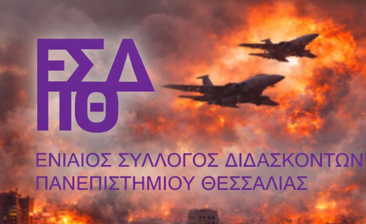 Ο Ενιαίος Σύλλογος Διδασκόντων του Πανεπιστημίου Θεσσαλίας, με ανακοίνωσή του, τοποθετείται απέναντι στις τελευταίες πολεμικές εξελίξεις στη Μέση Ανατολή, καταδικάζοντας τη στρατιωτική κλιμάκωση και επισημαίνοντας τους κινδύνους από την εμπλοκή της Ελλάδας και των πανεπιστημίων στην πολεμική οικονομία.