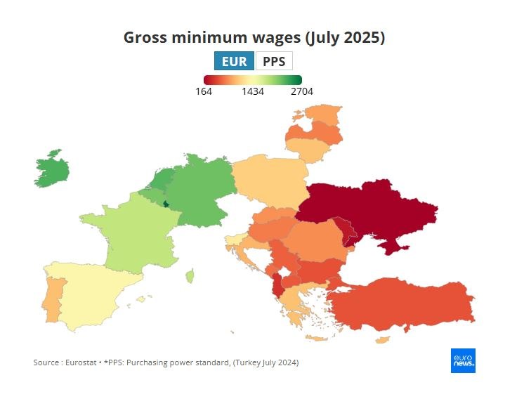 Σύμφωνα με στοιχεία της Eurostat για τον Ιούλιο του 2025, ο μηνιαίος κατώτατος μισθός πριν από κρατήσεις κυμαίνεται από 551 € στη Βουλγαρία έως 2.704 € στο Λουξεμβούργο. Αν προστεθούν οι υποψήφιες προς ένταξη χώρες, η Ουκρανία βρίσκεται στο χαμηλότερο σημείο με μόλις 164 €.