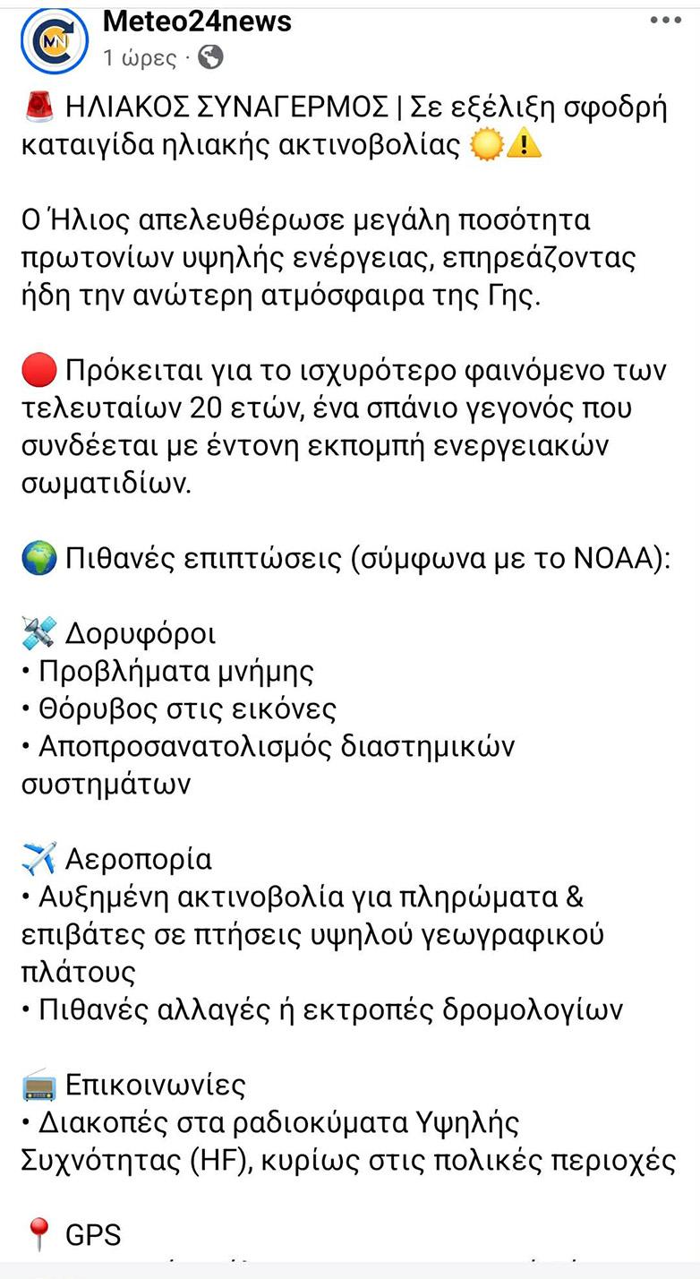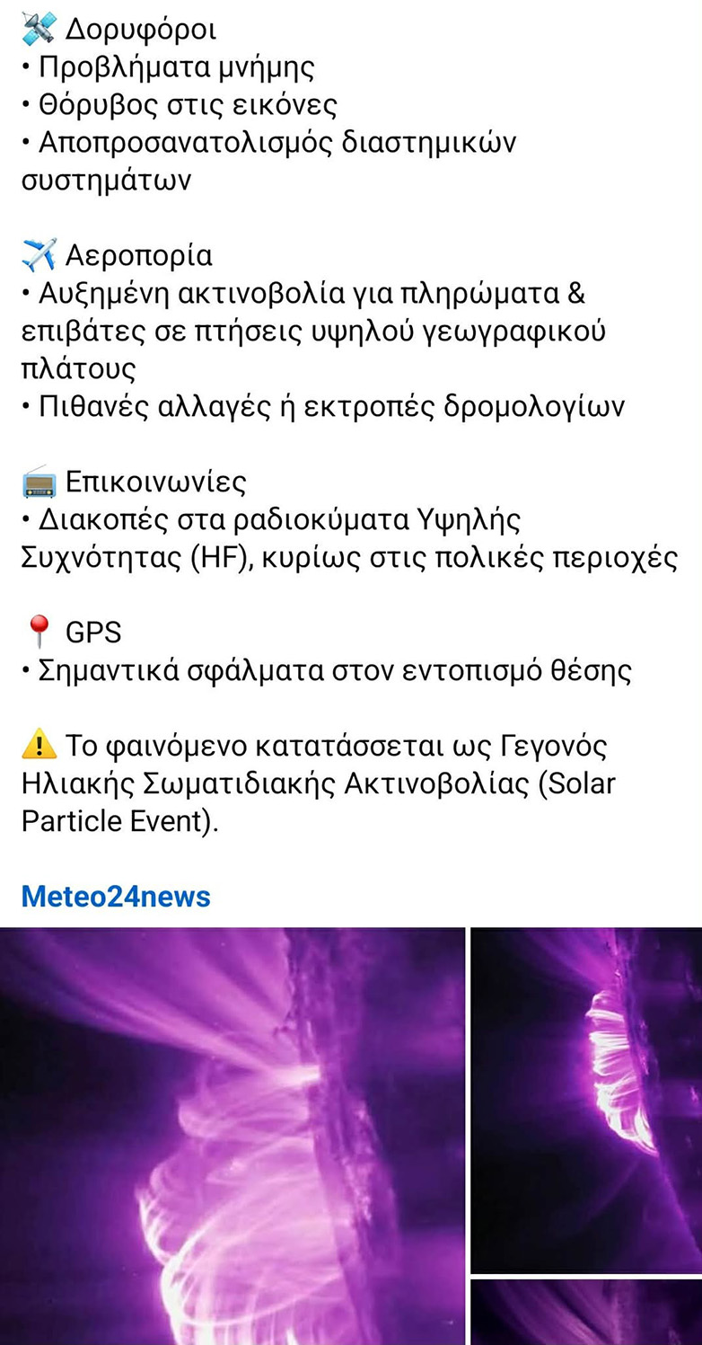 Παράλληλα, μια ηλιακή καταιγίδα αυτού του μεγέθους μπορεί να επηρεάσει δορυφόρους, συστήματα GPS, ασύρματες επικοινωνίες και υψηλής συχνότητας ραδιοκύματα, καθώς και πτήσεις που διασχίζουν τις πολικές περιοχές, όπου οι επιπτώσεις της ραδιενέργειας είναι ισχυρότερες.