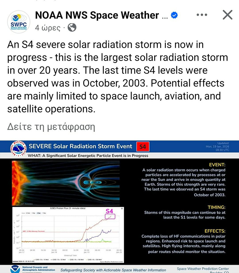 Η καταιγίδα έχει φτάσει στην κατηγορία S4 στη διεθνή κλίμακα μέτρησης των ηλιακών ραδιενεργών φαινομένων, σηματοδοτώντας ένα σημαντικό και σπάνιο γεγονός δραστηριότητας του Ήλιου.