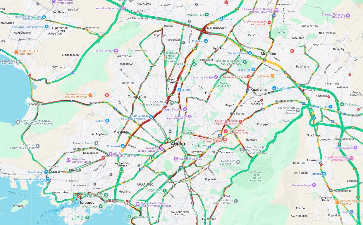 Στο κέντρο της Αθήνας τα αυτοκίνητα κινούνται κατά βάση σε χαμηλές ταχύτητες, όπως και στους δρόμους γύρω από το λιμάνι του Πειραιά.