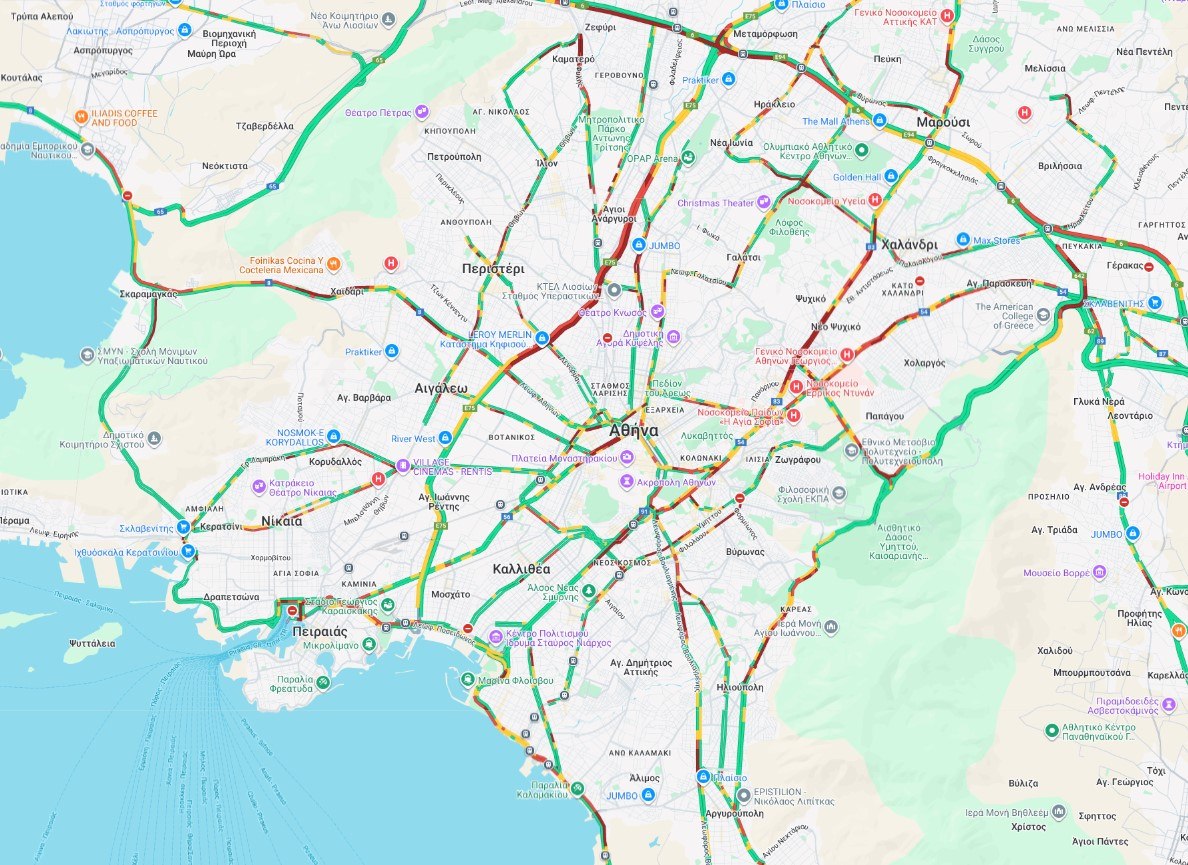 Κηφισίας και Μεσογείων κατά τόπους παρουσιάζουν σημάδια «ασφυξίας», ενώ και σε Βασ. Σοφίας και Βασ. Κωνσταντίνου η κυκλοφορία είναι αυξημένη.