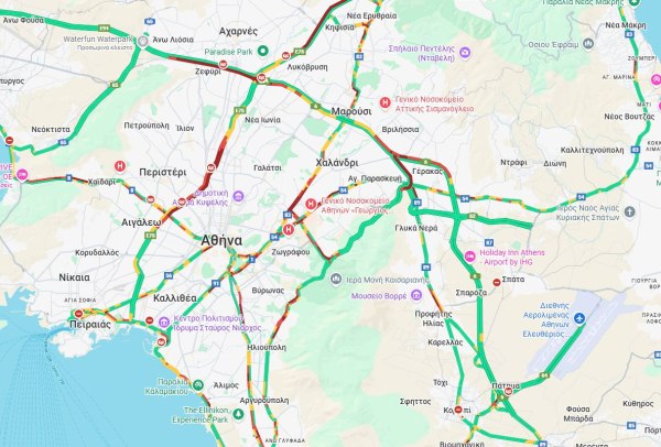 Καθυστερήσεις στην Αττική Οδό στο ρεύμα προς Ελευσίνα: 10΄-15΄από Πλακεντίας έως Κηφισίας, 15΄-20΄ από Αγία Παρασκευή έως Κηφισίας στην Περιφ. Υμηττού και στο ρεύμα προς Αεροδρόμιο άνω των 45΄από Φυλής έως Κηφισίας.