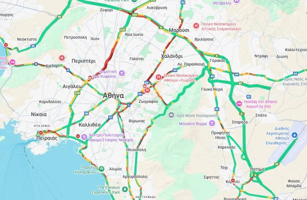 Στο κόκκινο είναι και η λεωφόρος Ελευθερίου Βενιζέλου στο ύψος του Καρέα, η Ποσειδώνος, η Κηφισίας και η Μεσογείων. Τέλος, με χαμηλές ταχύτητες κινούνται οι οδηγοί επί της λεωφόρου Αθηνών μέχρι τον Σκαραμαγκά.