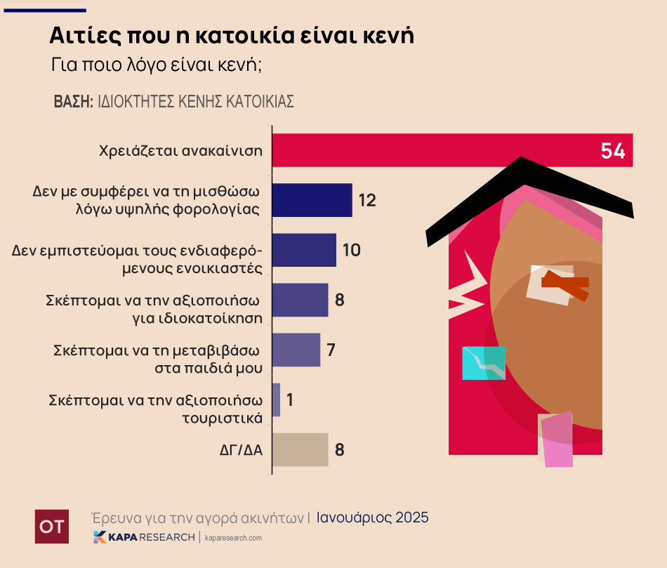 Ο βασικός λόγος είναι η ανάγκη για ανακαίνιση, καθώς το 54% των ερωτηθέντων αναφέρει ότι οι κατοικίες χρειάζονται εκτεταμένες επισκευές.