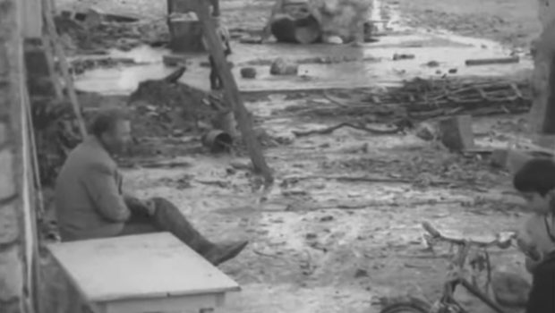 Και ακριβώς από κάτω οι υπότιτλοι αναφέρουν: «Τα ύδατα εισώρμησαν εις βάθος από 20 έως 50 μέτρων εις την ξηράν – 10 τραυματίαι και καταρρεύσις οικιών εις Σελιανίτικα. Πανικός μεταξύ των κατοίκων. Ζημίαι και εις άλλας περιοχάς».