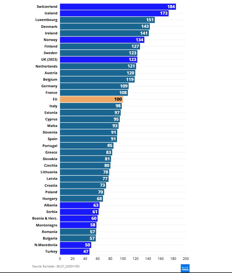 Τα επίπεδα τιμών είναι επίσης χαμηλότερα στις υποψήφιες προς ένταξη στην ΕΕ χώρες. Σε αυτές περιλαμβάνονται η Τουρκία, η Βόρεια Μακεδονία, η Αλβανία, η Σερβία και η Βοσνία-Ερζεγοβίνη.