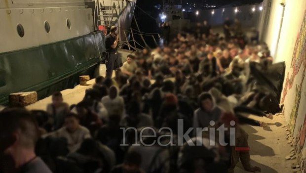 Η Κρήτη ήδη αντιμετωπίζει σοβαρό πρόβλημα διαχείρισης, με περισσότερους από 1.200 μετανάστες να έχουν αποβιβαστεί στο νησί τις τελευταίες 48 ώρες (στη φωτογραφία, επάνω, οι μετανάστες έχουν αποβιβαστεί τη νύχτα στο λιμάνι της Αγίας Γαλήνης).