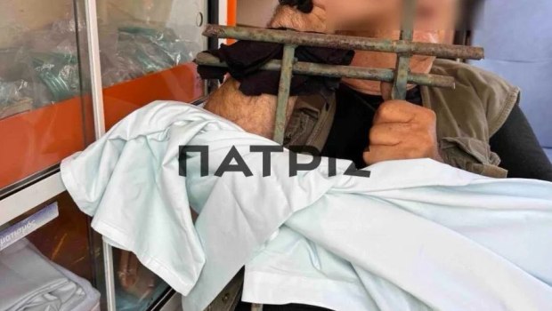 Οι διασώστες της ΕΜΑΚ έκοψαν το σίδερο επιτόπου, ώστε να διασφαλιστεί η ασφαλής μεταφορά του ηλικιωμένου, χωρίς να επιδεινωθεί ο τραυματισμός του.