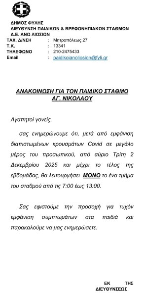 Συναγερμός έχει σημάνει στον Παιδικό Σταθμό Αγίου Νικολάου στα Άνω Λιόσια, μετά την εμφάνιση σημαντικού αριθμού επιβεβαιωμένων κρουσμάτων Covid-19 μεταξύ του προσωπικού. Σύμφωνα με επίσημη ανακοίνωση της Διεύθυνσης Παιδικών & Βρεφονηπιακών Σταθμών του Δήμου Φυλής, από την Τρίτη 2 Δεκεμβρίου 2025 και έως το τέλος της εβδομάδας, ο σταθμός θα λειτουργεί μόνο με ένα τμήμα και περιορισμένο ωράριο, από τις 7:00 έως τις 13:00.
