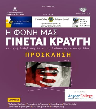 Ανοιχτή εκδήλωση λόγου και τέχνης “Η φωνή μας γίνεται κραυγή” ενάντια στην ενδοοικογενειακή βία διοργανώνουν οι ΟΙ LIONS CLUBS INTERNATIONAL Ελλάδα – Κύπρος ΚΑΙ ΤΟ LIONS BRANCH Λάρισα «ΑΣΚΛΗΠΙΑΣ» της Λέσχης Θεσσαλονίκη Ηράκλεια, υπό την Αιγίδα της Περιφέρειας Θεσσαλίας και του Δήμου Λαρισαίων, στις 21 Σεπτεμβρίου 2024 στις 8 μ.μ στο Δημοτικό Ωδείο.