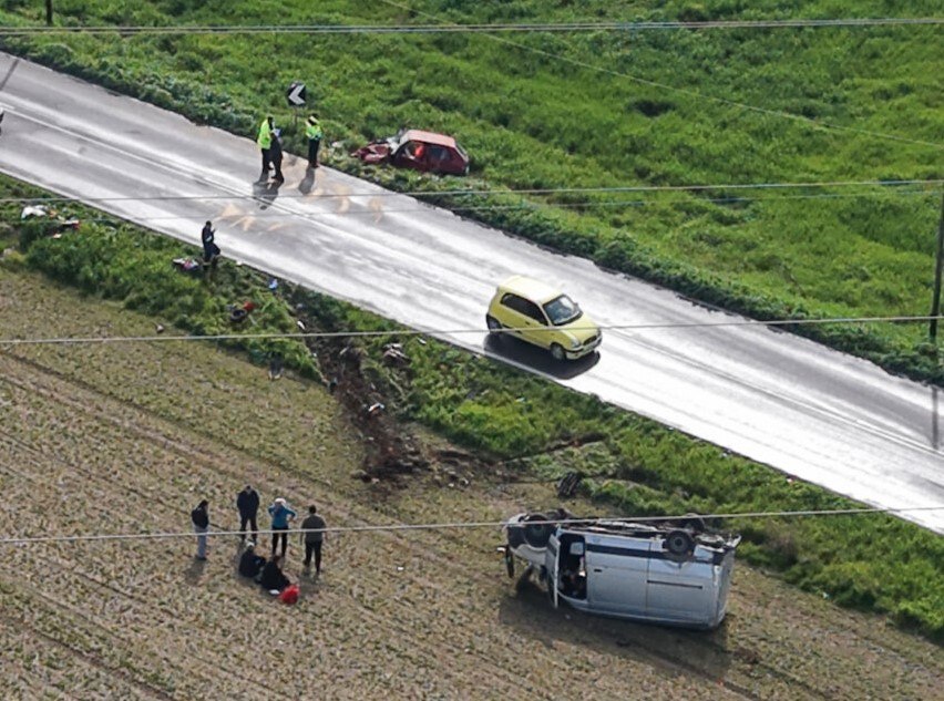 Σύμφωνα με τα πρώτα στοιχεία τα δύο από τα οχήματα μετά τη σύγκρουση βγήκαν από τον δρόμο, το βαν αναποδογύρισε ενώ το ΙΧ κατέληξε σε παρακείμενο χωράφι.