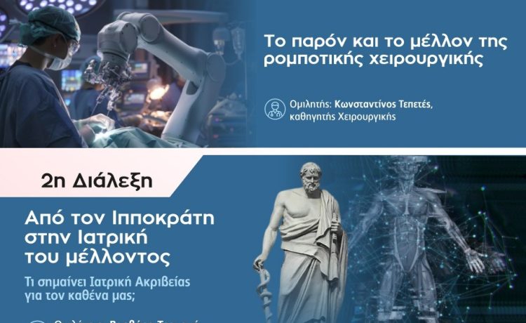 Η 9η διάλεξη θα πραγματοποιηθεί, αύριο, Σάββατο 14 Μαρτίου 2026, στις 18:00, στο Γαλλικό Ινστιτούτο Λάρισας με ελεύθερη είσοδο για το κοινό. Στο πρώτο μέρος της διάλεξης, ο Καθηγητής Χειρουργικής Κωνσταντίνος Τεπετές θα αναπτύξει το θέμα: «Το παρόν και το μέλλον της ρομποτικής χειρουργικής». Ο κ. Τεπετές (MD, ScD, FACS, FEBS) είναι Καθηγητής Χειρουργικής του Τμήματος Ιατρικής του Πανεπιστημίου Θεσσαλίας και διακεκριμένος Χειρουργός Ογκολογίας με ευρωπαϊκή πιστοποίηση EBSQ και μέλος του American College of Surgeons (ACS). Έχει εξειδικευθεί στη χειρουργική ήπατος, παγκρέατος και παχέος εντέρου σε διεθνώς αναγνωρισμένα κέντρα, όπως το University of Pittsburgh Medical Center και το Royal Marsden Hospital.