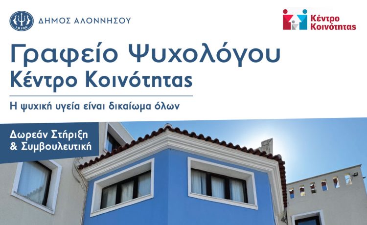 Ο Δήμος Αλοννήσου ενημερώνει τους δημότες ότι στο Κέντρο Κοινότητας λειτουργεί πλέον Γραφείο Ψυχολόγου, προσφέροντας δωρεάν υπηρεσίες ψυχοκοινωνικής στήριξης και ενδυνάμωσης.