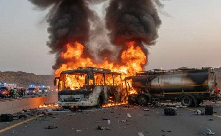 Λεωφορείο που μετέφερε προσκυνητές του Ουμρά συγκρούστηκε με βυτιοφόρο ντίζελ κοντά στη Μεδίνα με αποτέλεσμα να πάρει φωτιά ολοσχερώς.