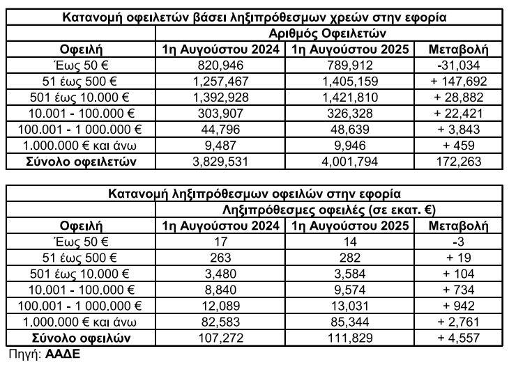 Αναφορικά με τον συνολικό αριθμό των οφειλετών, στο τέλος Ιουλίου του 2025 παρατηρείται αύξηση κατά 172.263 πρόσωπα (φυσικά και νομικά) σε σχέση με την αντίστοιχη περίοδο του 2024 με αποτέλεσμα να διαμορφώνεται στους 4.001.794 οφειλέτες.