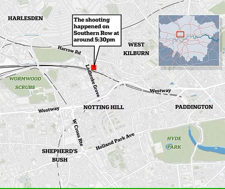 Αξιωματικοί της Μητροπολιτικής Αστυνομίας κλήθηκαν στο Southern Row, στο Κένσινγκτον, στις 5.34 μ.μ. την Κυριακή 24/11, μετά από αναφορές για πυροβολισμούς.