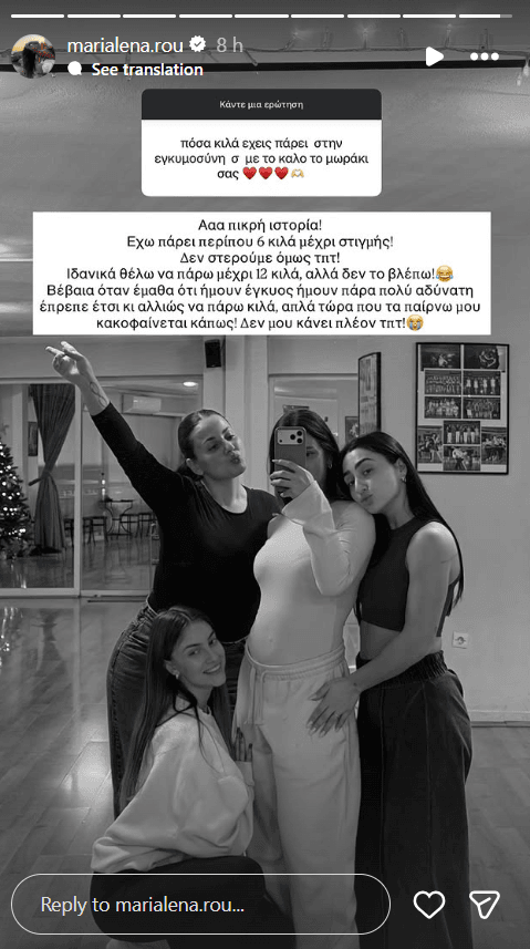 «Ααα πικρή ιστορία! Έχω πάρει περίπου 6 κιλά μέχρι στιγμής! Δεν στερούμαι όμως τίποτα! Ιδανικά θέλω να πάρω μέχρι 12 κιλά, αλλά δεν το βλέπω!