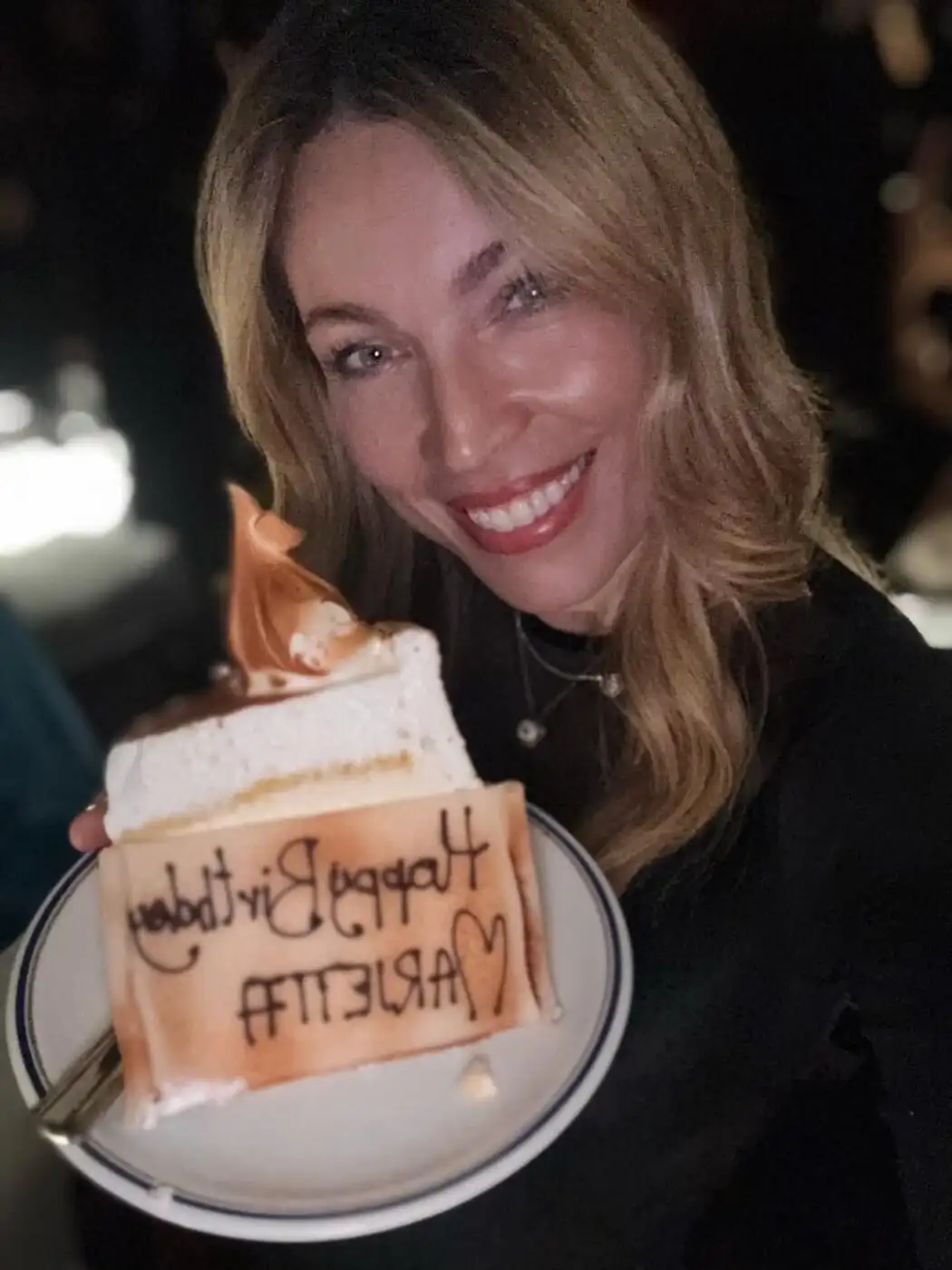 Όσο για την τούρτα, η Μαριέττα Χρουσαλά μας έδειξε το δικό της κομμάτι, στο οποίο γράφει πάνω “Χρόνια πολλά”.