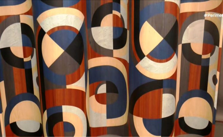 Φύλλα ξύλου δουλεμένα σε πιεστήριο για να πάρουν κυρτό σχήμα και να συναρμολογηθούν σε ένα διαχωριστικό, με γεωμετρικά μοτίβα, βαμμένο σε μια εξάχρωμη παλέτα ψυχρών και θερμών χρωμάτων.