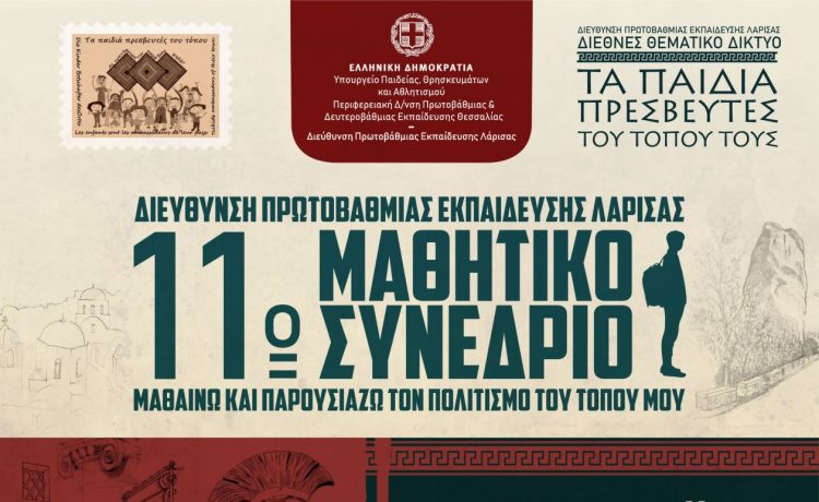 H Διεύθυνση Πρωτοβάθμιας Εκπαίδευσης Λάρισας, διοργανώνει το 11ο Μαθητικό Συνέδριο με τίτλο: «Μαθαίνω & Παρουσιάζω τον Πολιτισμό του τόπου μου», το οποίο θα πραγματοποιηθεί την Τετάρτη 29/5/2024 στην Αίθουσα Εκδηλώσεων της Δημοτικής Πινακοθήκης – Μουσείο Γ.Ι. Κατσίγρα και την Πέμπτη 30/5/2024 στο πάρκο Αλκαζάρ.