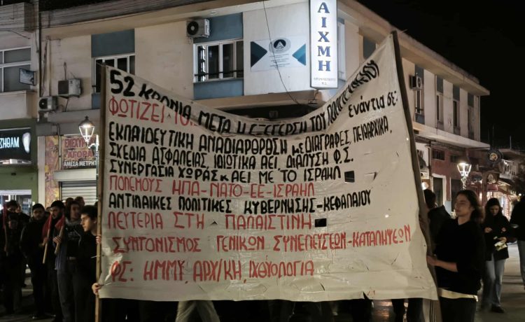 Με παλμό, πυκνή παρουσία διαδηλωτών και έντονο συμβολισμό ξεκίνησε λίγα λεπτά μετά τις 6:30 το απόγευμα η μεγάλη συγκέντρωση για την επέτειο των 52 χρόνων από την εξέγερση του Πολυτεχνείου, στη Θόλο του παραλιακού συγκροτήματος του Πανεπιστημίου Θεσσαλίας.