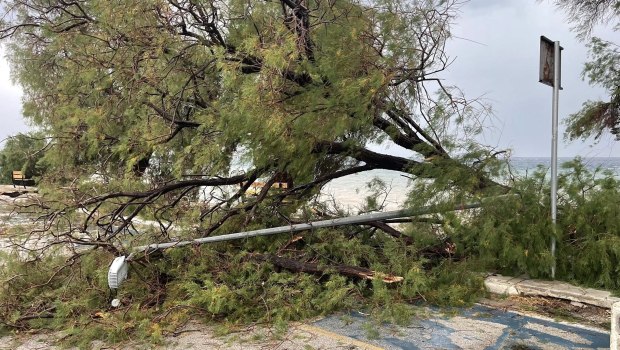 Όπως φαίνεται και στις εικόνες ο δρόμος μπροστά στην παραλία έχει κλείσει από τα πεσμένα δέντρα.