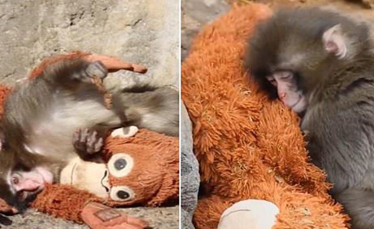 Μικρός πίθηκος ζει αγκαλιά με ένα λούτρινο