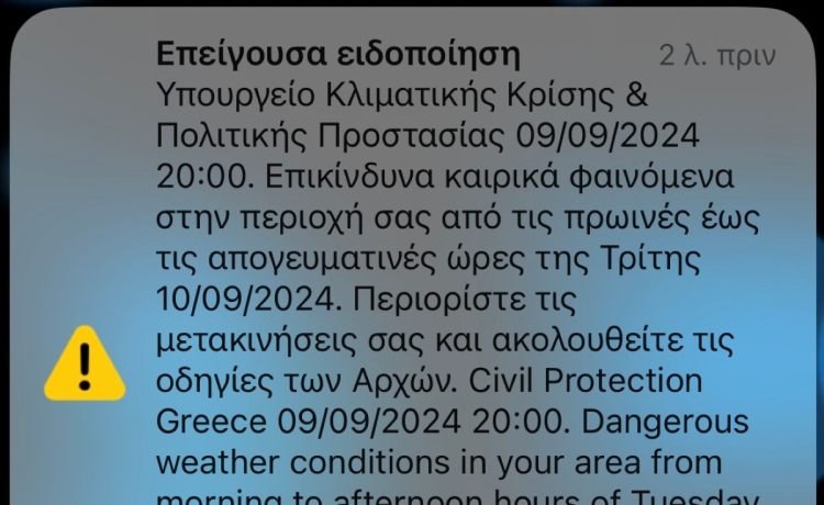 Σύμφωνα με το μήνυμα αναμένονται επικίνδυνα καιρικά φαινόμενα στην περιοχή από τις πρωινές έως τις απογευματινές ώρες της Τρίτης 10/09/2024 20:00