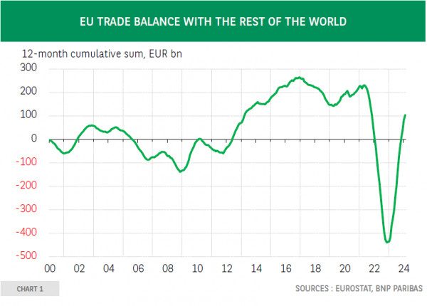 Το εμπορικό ισοζύγιο της Ευρωπαϊκής Ένωσης με τον υπόλοιπο κόσμο ανέκαμψε σημαντικά το 2023, επιστρέφοντας σε θετικά εδάφη, μετά από δύο χρόνια που χαρακτηρίστηκαν από μια άνευ προηγουμένου επιδείνωση που οδήγησε στο έλλειμμα ρεκόρ των 436,1 δισ. ευρώ (2,7% του ΑΕΠ της ΕΕ) το 2022. Έτσι, κατά την BNP Paribas, η πλεονασματική θέση της ΕΕ που επικρατούσε πριν από την ενεργειακή κρίση, αποκαθίσταται σταδιακά.