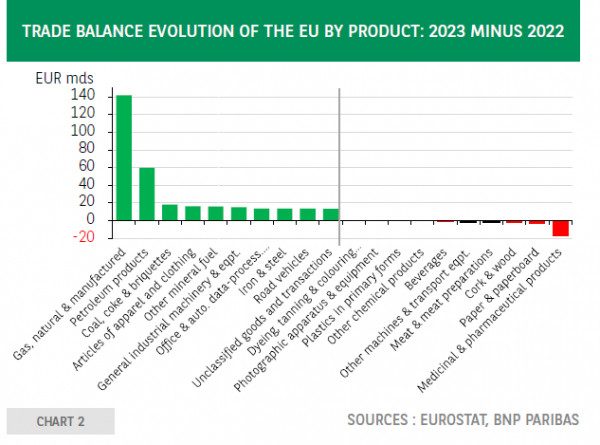 Άλλα είδη, τα οποία επηρέασαν σχετικά λίγο σε σύγκριση με την ενέργεια, ανέβασαν επίσης το εμπορικό ισοζύγιο το 2023. Αυτό ισχύει ιδιαίτερα για τα κλωστοϋφαντουργικά προϊόντα και τα είδη ένδυσης, καθώς και τα μηχανήματα και τον εξοπλισμό «γενικής βιομηχανικής χρήσης». Αντίθετα, τα ιατρικά και φαρμακευτικά προϊόντα και, σε μικρότερο βαθμό, το χαρτί και το ξύλο, επιβάρυναν τα πιο αρνητικά στο ευρωπαϊκό εμπορικό ισοζύγιο πέρυσι.