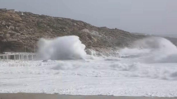 Στη Μύκονο οι εικόνες από την θάλασσα στην περιοχή του Καλαφάτη είναι συγκλονιστικές και αποτυπώνουν τη δύναμη της φύσης.