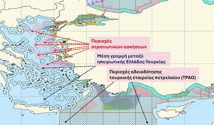 • Περιοχές στρατιωτικών ασκήσεων σε όλο σχεδόν το κεντρικό και βόρειο Αιγαίο, μέχρι έξω από το Άγιο Όρος.