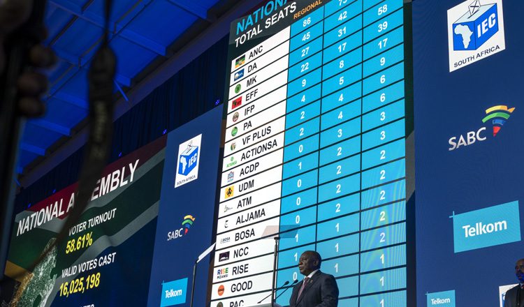 Το Εθνικό Αφρικανικό Κογκρέσο (ANC), το κυβερνών κόμμα στη Νότια Αφρική τα τελευταία τριάντα χρόνια, έχασε την απόλυτη πλειοψηφία του στο κοινοβούλιο για πρώτη φορά στην ιστορία του, λαμβάνοντας μόλις 159 έδρες σε σύνολο 400, σύμφωνα με τα επίσημα αποτελέσματα που ανακοίνωσε σήμερα η εκλογική επιτροπή.
