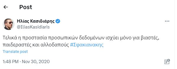 Σημειώνεται ότι ο φυλακισμένος χρυσαυγίτης, Ηλίας Κασιδιάρης, είχε σπεύσει να υπερασπιστεί τον Νότη Σφακιανάκη, όταν ο τραγουδιστής είχε συλληφθεί το 2020 για ναρκωτικά και οπλοκατοχή, στέλνοντας μέσω twitter μήνυμα συμπαράστασης