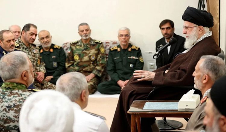 Ο Ανώτατος Ηγέτης του Ιράν, Αγιατολάχ Αλί Χαμενεΐ, με στρατιωτικούς ηγέτες, τον Απρίλιο. Πίστωση: AFP