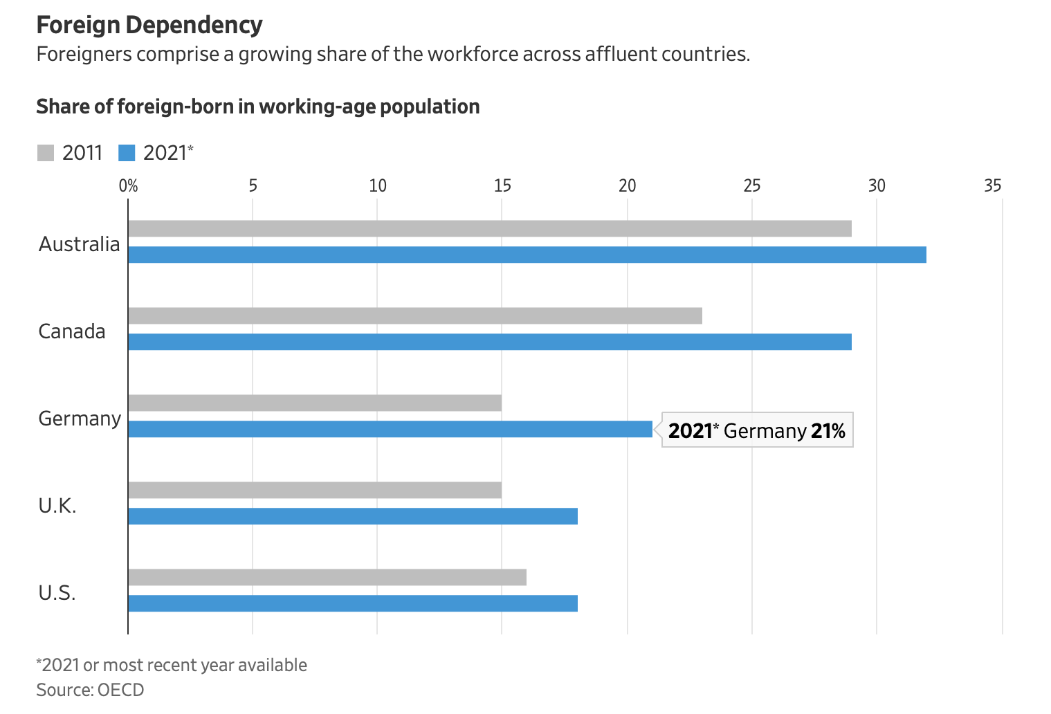 Παρά το γεγονός ότι υποσχόταν επί δεκαετίες να περιορίσει τη μετανάστευση, το Ηνωμένο Βασίλειο έχει δει μια έκρηξη από την έξοδό του από την ΕΕ το 2020, καθώς οι επιχειρήσεις αγωνίζονται για υπαλλήλους. Περισσότερο από το 27% των νοσηλευτών της Εθνικής Υπηρεσίας Υγείας είναι από το εξωτερικό σήμερα, από περίπου 14% το 2013. Στη Γερμανία, περίπου το 80% των εργαζομένων στα σφαγεία είναι μετανάστες, εκτιμούν τα συνδικάτα.