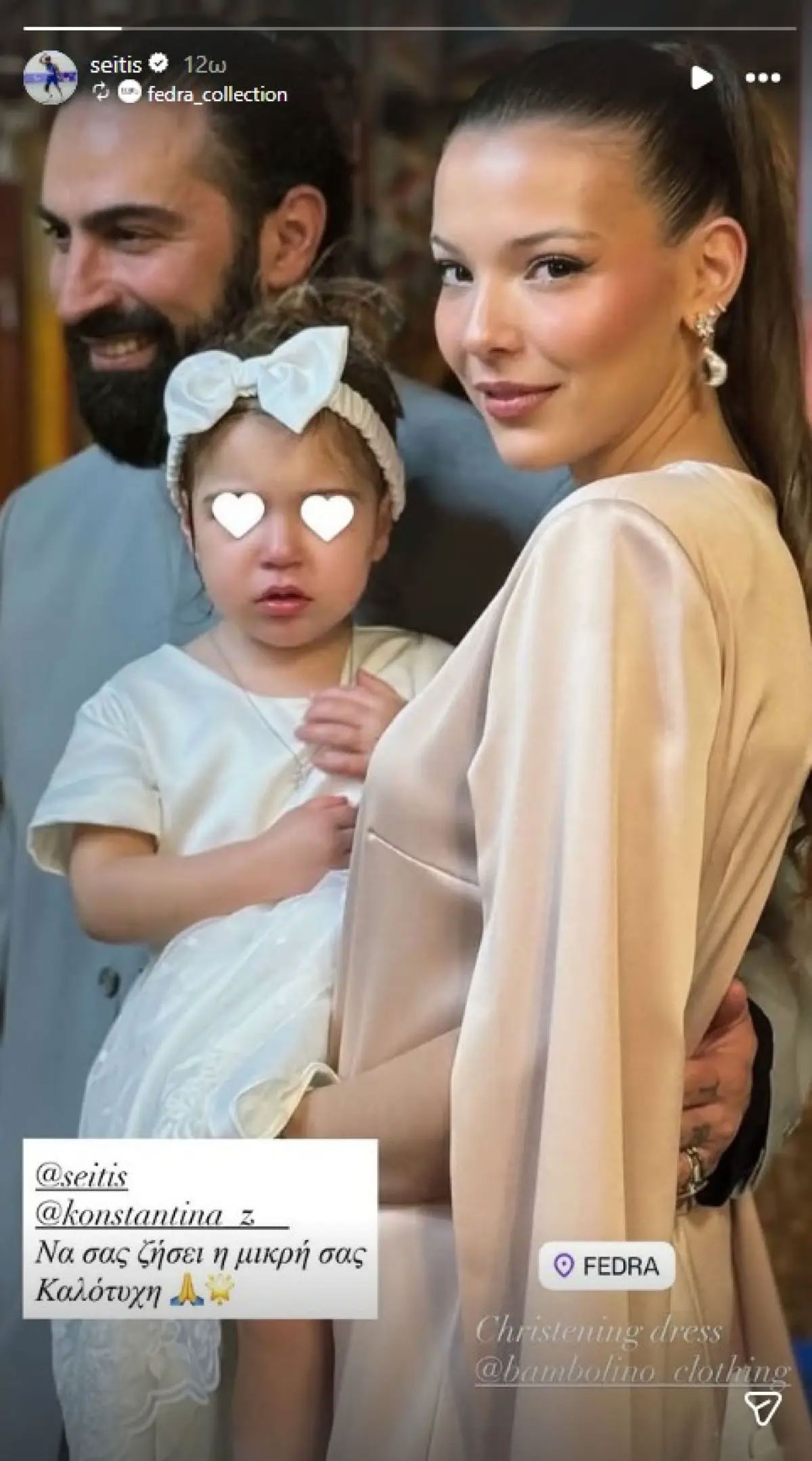 Η μικρή, που γεννήθηκε το 2023, πήρε το ξεχωριστό όνομα Ίσιδα Αστερόπη, μελωδικό και γεμάτο συμβολισμό. Το μυστήριο πραγματοποιήθηκε στον Ιερό Ναό Αγίου Νεκταρίου στο Νέο Ηράκλειο, έναν χώρο που επέλεξαν οι γονείς για τη ζεστασιά και την πνευματικότητά του.