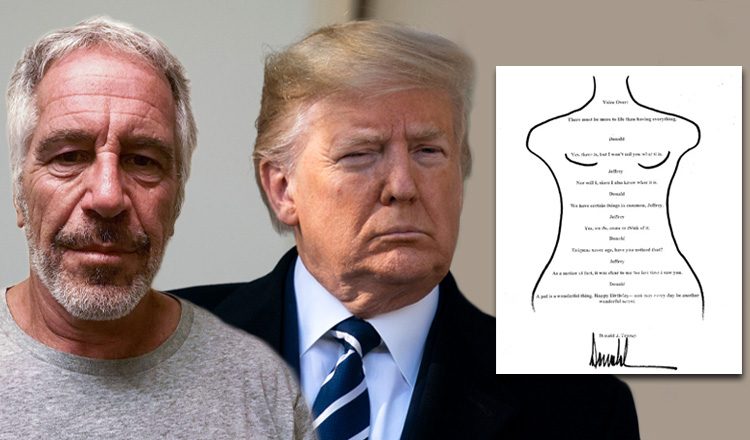 Η επιστολή, χρονολογημένη το 2003, περιλαμβάνει ένα σύντομο διάλογο μεταξύ «Ντόναλντ» και «Τζέφρι» και είναι τυπωμένη πάνω σε σκίτσο γυμνής γυναίκας, με την υποτιθέμενη υπογραφή του Τραμπ να εμφανίζεται στο σημείο των γεννητικών οργάνων. Σύμφωνα με πληροφορίες, η επιστολή περιλαμβανόταν σε βιβλίο ευχών που συνέταξε η Γκισλέιν Μάξγουελ για τα 50ά γενέθλια του Έπστιν.