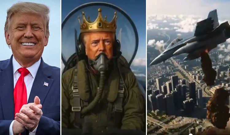 Το βίντεο, παραγμένο με τεχνητή νοημοσύνη, δείχνει τον Τραμπ να φοράει στέμμα σαν βασιλιάς — σαρκάζοντας το κίνημα «No Kings» — και να πιλοτάρει ένα μαχητικό αεροσκάφος με το όνομα «King Trump», ρίχνοντας βόμβες με περιττώματα πάνω στο πλήθος. Η εικόνα συνοδεύεται από ανάλογες δημοσιεύσεις του επίσημου λογαριασμού του Λευκού Οίκου στο X, όπου ο Τραμπ και ο αντιπρόεδρός του Βανς εμφανίζονται με κορώνες, ενώ ο ηγέτης της μειοψηφίας της Βουλής, Χάκιμ Τζέφρις, και ο γερουσιαστής Τσακ Σούμερ φορούν σομπρέρος.