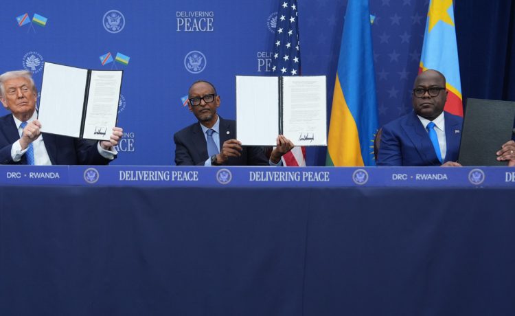 Ο Ντόναλντ Τραμπ προήδρευσε την Πέμπτη στην Ουάσινγκτον της τελετής υπογραφής ειρηνευτικής συμφωνίας με τους ομολόγους του από τη ΛΔ Κονγκό και τη Ρουάντα, σε ένα κτήριο που μετονομάστηκε προς τιμήν του, μιλώντας για “θαύμα” και ενώ σφοδρές μάχες συνεχίζονται στο ανατολικό τμήμα της Λαϊκή Δημοκρατίας του Κονγκό.