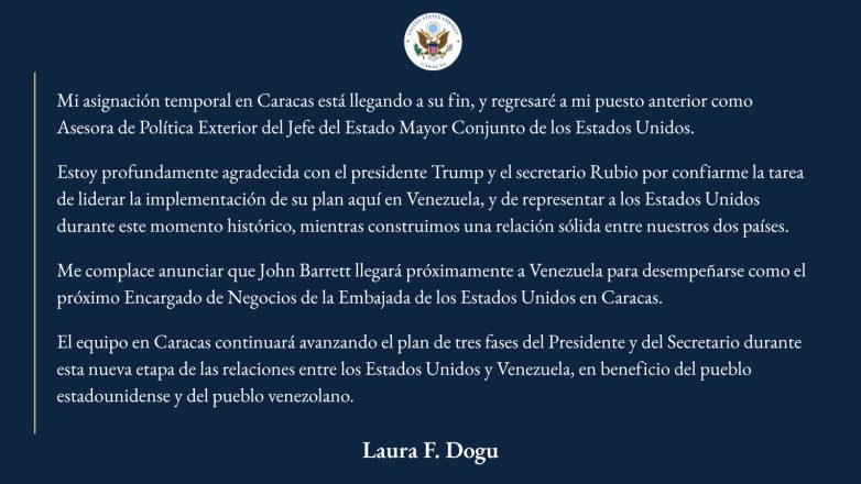 «Έχω την ευχαρίστηση να ανακοινώσω ότι ο Τζον Μπάρετ θα αφιχθεί προσεχώς στη Βενεζουέλα για να αναλάβει καθήκοντα επιτετραμμένου στην πρεσβεία των ΗΠΑ στο Καράκας» ανέφερε η Ντόγκου σε αυτήν την ανακοίνωση που αναρτήθηκε στην πλατφόρμα Χ.