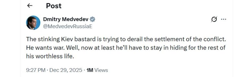 «Ο βρομερός μπάσταρδος του Κιέβου προσπαθεί να εκτροχιάσει την επίλυση της ‘σύγκρουσης’. Θέλει πόλεμο. Λοιπόν, τώρα τουλάχιστον θα πρέπει να παραμείνει κρυμμένος για το υπόλοιπο της άχρηστης ζωής του», έγραψε ο πρώην πρόεδρος και πρωθυπουργός της Ρωσίας στην πλατφόρμα κοινωνικής δικτύωσης X.