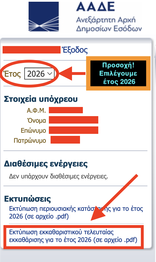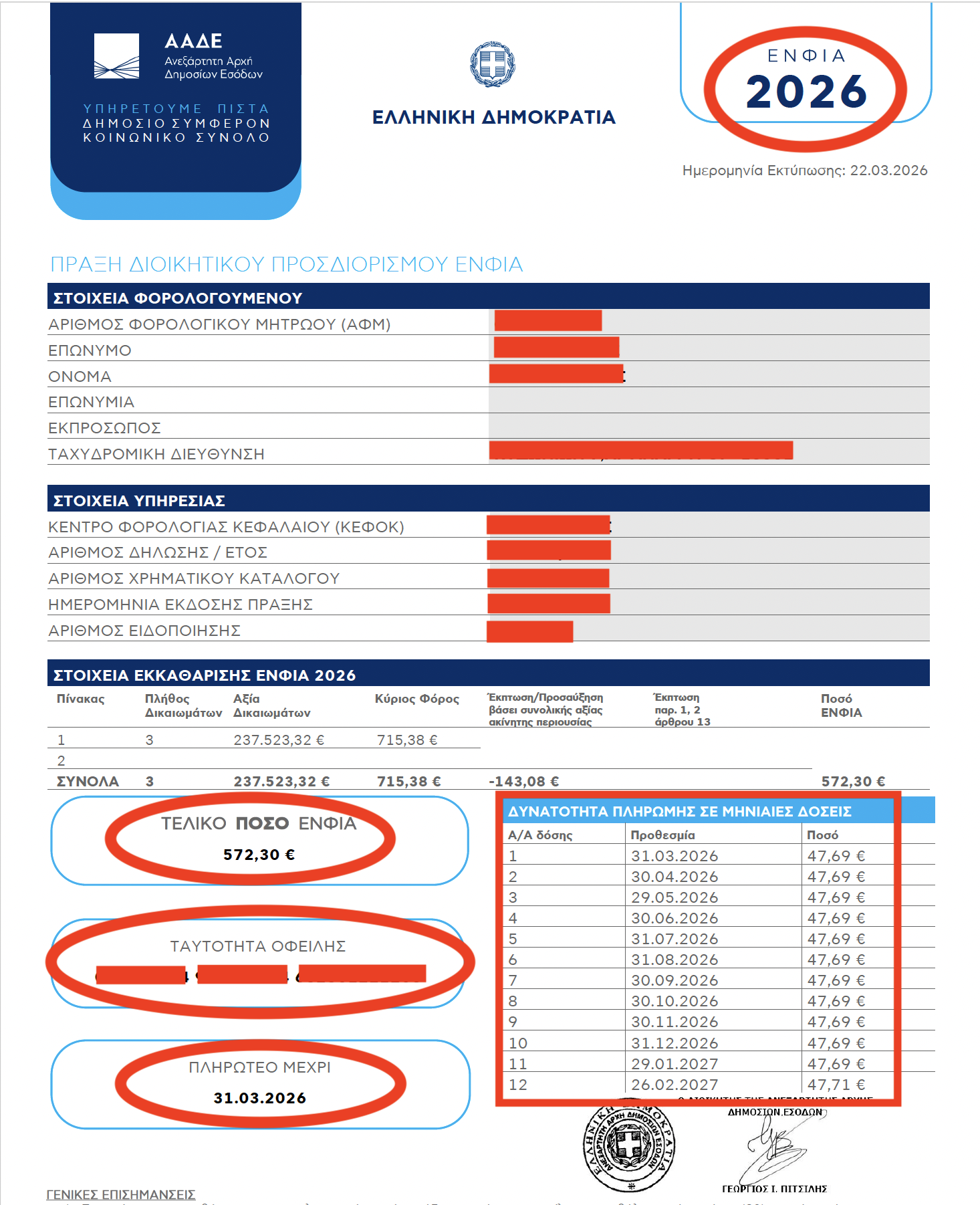 Ο Οικονομικός Ταχυδρόμος παρουσιάζει σήμερα, μέσα από πραγματικά στοιχεία ιδιοκτήτη ακινήτου, βήμα – βήμα τη διαδικασία εκτύπωσης του εκκαθαριστικού σημειώματος ΕΝΦΙΑ 2026. Μέσα από 11 «κλικ» μπορεί κάποιος να βρει το φόρο που του αναλογεί και το βασικότερο να μάθει την ταυτότητα οφειλής ώστε στη συνέχεια να τον αποπληρώσει είτε σε δόσεις είτε εφάπαξ.